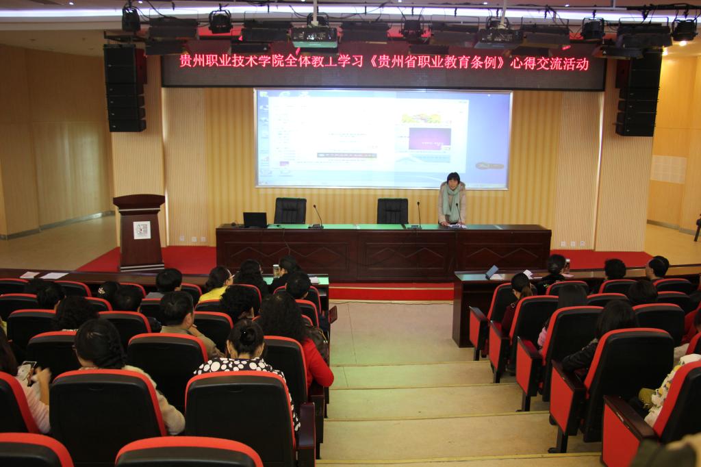 按照教育厅要求,在院领导指示下,教务处印发了《关于开展<贵州省职业教育条例>学习心得交流活动的通知》,并于4月10日下午2点组织各系、部、实训中心全体教师在图书馆二楼报告厅开展了《贵州省职业教育条例》学习心得交流活动。李勤副院长、教务处孙莉、张涤副处长莅临现场,和全体教师亲切交流。