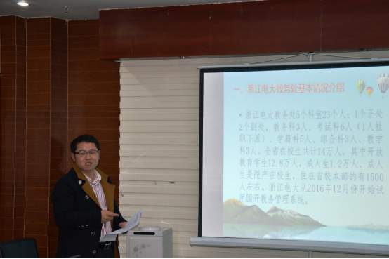 曾宏诚老师深入细致地从浙江电大教务处基本情况、考务工作、省开课、成人及中开课程考试情况、学籍工作等方面汇报了到浙江电大交流学习的情况。