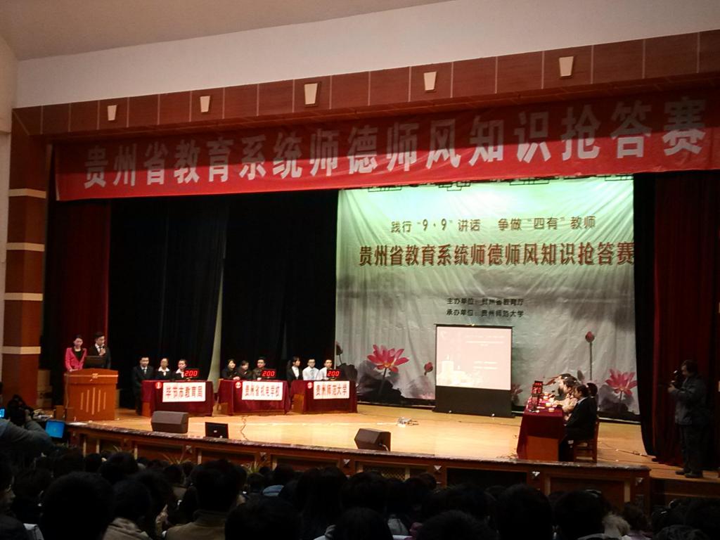 1月8日下午,贵州省教育系统师德师风知识抢答赛在贵州师范大学宝山校区大礼堂举行。来自全省九个市(州)、贵安新区和省属高校、职业院校、普通高中学校的14支代表队参加角逐,省委教育工委副书记赵廷昌、省教育纪工委书记罗润生、省教育厅工会主席王慧、省教育厅巡视员李小建,贵州师大党委书记韩卉、副校长蔡永生、纪委书记唐本文以及省教育厅机关处室负责人,各省直高校、省属职业院校、普通高中学校的领导和师生代表共1000余人观看了比赛。我院教务处组织50名教师由龚辉副院长、监察室卢达文处长带队参加观摩学习。