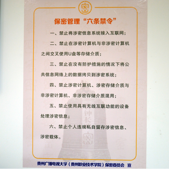 期间,教务处再次对各类考试保密制度进行梳理和完善,特别针对2015-2016年度电大、职院考试保密培训、会议记录,试卷保管记录,相关文件,培训通知,试卷印制、保管相关记录和承诺书书等材料进行了核查,配合教务处保密室之前上墙的试卷保密室值班工作规定、保密室管理暂行规定,教务处还在保密值班室粘贴了保密委统一制作的“保密管理‘六条禁令’”以提醒和警示相关人员,在思想上构筑严密的保密防线。教务处全体工作人员表示,通过再次梳理和学习,大大增强了全体工作人员的保密责任感,巩固和丰富了保密知识,今后将在工作中时时树立保密意识,严格要求自己认真履行工作职责。