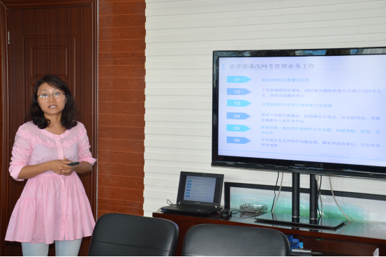 郭静老师耐心、细致地从省开课课改网考平台管理、新老教务系统管理、电大毕业审查、系统科目表制作、成绩合成发布、职院清考补考期末考试等方面交流了各项具体工作业务,教务处全体人员积极讨论、相互学习,部门更加融通、更加团结。