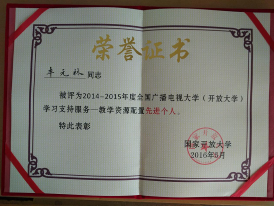 我校荣获了2014-2015年度全国广播电视大学(开放大学)学习支持服务——教学资源配置“先进单位”;教材科丰元林同志荣获教学资源配置“先进个人”。