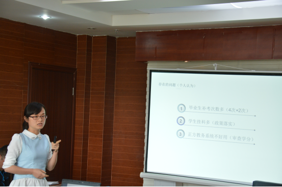 蒋华丽老师耐心、细致地从考务工作、教务工作、综合管理工作三大方面,详尽的介绍了3、9月补考、4月单独招生考试、5、10月毕业补考、6、11月毕业审查、7、12月期末考试、6、12月CET考试、3、9月计算机等级考试、教务系统、外聘教师讲座、教学检查、学生事务中心、技能奖励、采购报账、库房管理等各项具体工作业务,教务处全体人员积极讨论、相互学习,部门更加融通、更加团结。