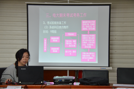 王帆副科长从电大考务工作概述、开学初期考务工作、电大期末考试考务工作、电大其他类型考试等四个大的方面详细介绍原电大教务处考务科的相关工作,与会人员专心听讲、认真记录、相互交流,营造出共同学习、共同进步的良好氛围。