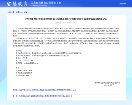 7月7日,2022年贵州省职业院校技能大赛暨全国职业院校技能大赛选拔赛传来喜讯。贵州省职业院校技能大赛组织委员会正式发布了《2022年贵州省职业院校技能大赛暨全国职业院校技能大赛选拔赛获奖名单公示》,我校共获奖43项,一等奖7项,二等奖19项,三等奖17项。省赛一等奖数量比去年增加4项,共4支队伍进入国赛,参加国赛队伍数量比去年增加3支。